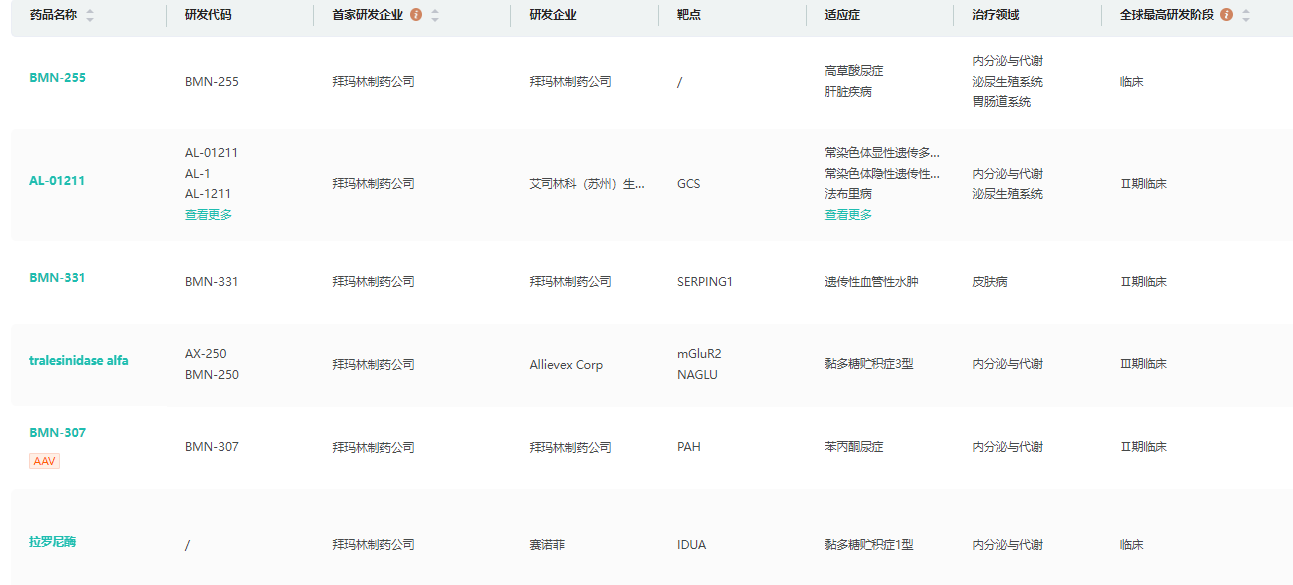 BioMarin的研发管线(部分)