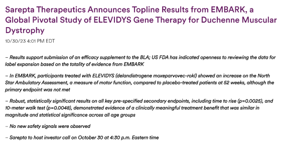 除了作为上市后验证性研究的EMBARK之外,Elevidys 也在三项正在进行的临床研究中进行了评估:SRP-9001-101、SRP-9001-102和SRP-9001-103。加速审批主要基于SRP-9001-102和SRP-9001-103的数据。