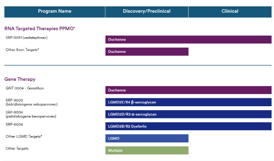Sarepta行业领先的产品线包括40多个处于不同开发阶段的项目,涉及3种技术,RNA,基因治疗和基因编辑,以及包括神经肌肉,中枢神经系统和心脏病学在内的多个治疗领域。目前,Sarepta在美国市场上有一种基因疗法和三种RNA疗法。