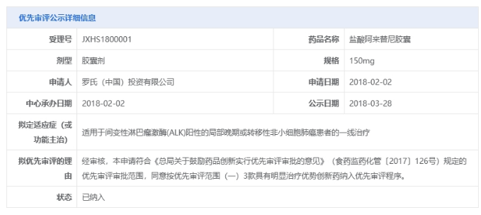 11月7日,CDE官网显示,由罗氏(中国)申报的盐酸阿来替尼胶囊新适应症拟纳入优先审评,拟定适应症为:用于间变性淋巴瘤激酶(ALK)阳性非小细胞肺癌患者肿瘤完全切除后术后的辅助治疗。