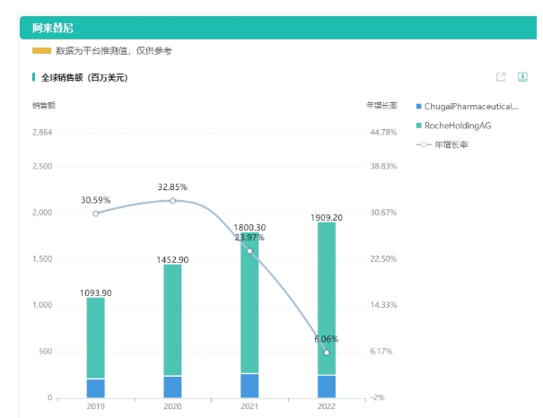 阿来替尼是罗氏开发的一款新一代ALK抑制剂。此前已于2018年在中国获批上市,用于治疗ALK阳性的局部晚期或转移性NSCLC。本次被CDE拟纳入突破性治疗品种的申请针对的是一项新的适应症:用于ALK阳性NSCLC患者的术后辅助治疗。据药融云数据统计,阿来替尼2022年全球销售达19亿,同比增长6.06%。