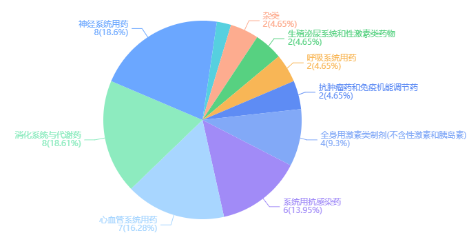 按拟中选品种的治疗领域分布来看,消化系统与代谢药、神经系统用药、心血管系统用药位列前三甲,分别占比18.61%、18.6%、13.95%。