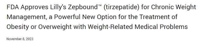 11月8日,Lilly公司表示,美国食品和药物管理局(FDA)批准了该公司的Zepbound™(tirzepatide,替尔泊肽)注射液,这标志着Lilly的tirzepatide正式进入慢性体重管理市场。这是首款也是唯一一款葡萄糖依赖性促胰岛素多肽(GIP)和胰高血糖素样肽-1(GLP-1)受体双重激动剂的肥胖症治疗药物。