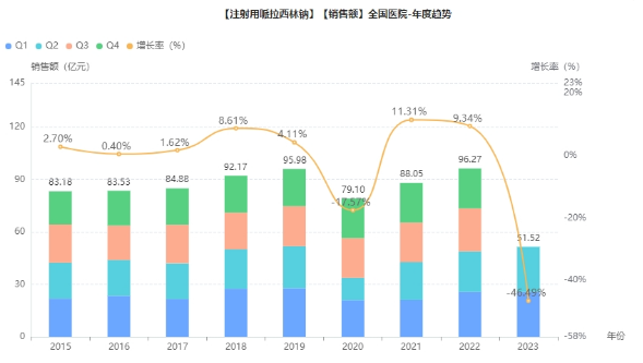 哌拉西林钠在国内上市销售的时间是1986年,由湖南科伦制药销售。注射用哌拉西林钠作为注射用哌拉西林钠他唑巴坦钠的“小弟”,在2021年之前的销售量开始迅速增长。院内销售额达88亿,同比增长11.31%。2022年,其销售量继续增长,销售额近百亿,达96.3亿,同比增长9.34%。