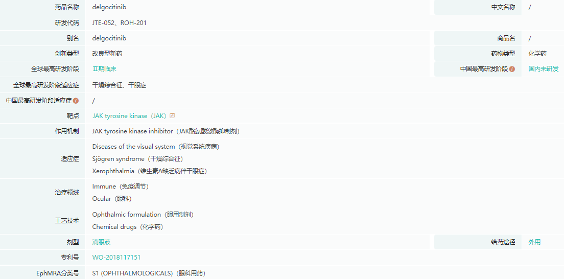 ROH-201(Delgocitinib,迪高替尼)是一款JAK抑制剂,最初由日本烟草(JT)和鸟居制药(Torii Pharmaceutical)共同开发,2020年1月获日本PMDA批准,用于局部治疗特应性皮炎。这是全球首款治疗特应性皮炎的JAK局部外用药物。乐敦制药在2018年3月与日本烟草签订许可协议,并一直将该产品用于开发眼科疾病。目前乐敦正在开展ROH-201治疗干眼症(包括干燥综合征)的2期临床研究,预计将于2027年获得批准。