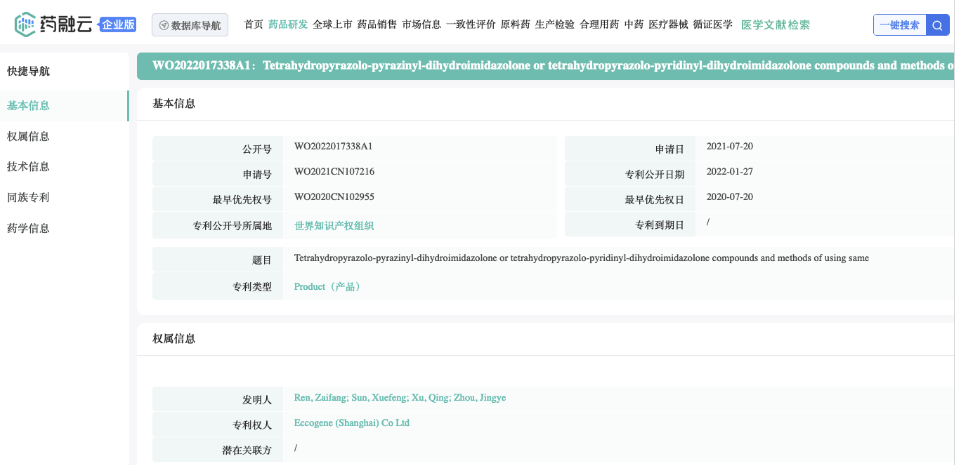 药融云数据库获悉:I 期临床试验的初步结果显示 ECC5004 具有差异化的临床优势,与安慰剂相比,具有良好的耐受性,并能促进血糖和体重的降低。每日一次、低剂量、高生物利用度是其主打特色之一(10-30mg)。本品相关专利:WO2022017338A1。专利对比参照为礼来制药的GLP-1小分子LY3502970。在前人的肩膀上做出的自主知识产权新候选分子。