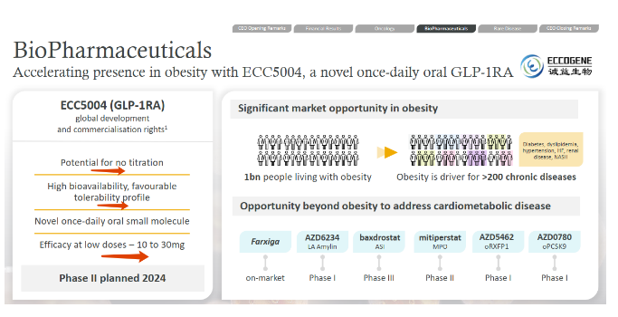 值得注意的是2023年6月终止其自主研发的口服 GLP-1R激动剂 AZD0186 的临床试验开发。此前还终止了GLP-1R/GCGR激动剂 cotadutide(MEDI-0382)的IIb / III 期的非酒精性脂肪性肝炎 (NASH)临床试验开发。此次加大力度引入中国候选分子,对其管线是很好的补充。