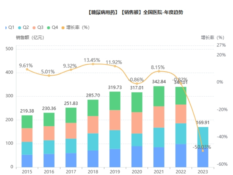 中国是“糖尿病大国”,有超过1.4亿糖尿病人群,其中约7283万例糖尿病患者尚未被确诊,且由于糖尿病需要终生服药,所以治疗药物市场坐拥巨大的需求量。据药融云数据库显示,中国糖尿病化学药/生物药院内销售额由2015年219亿元增长到2021年343亿元,年复合增长率为7.99%。