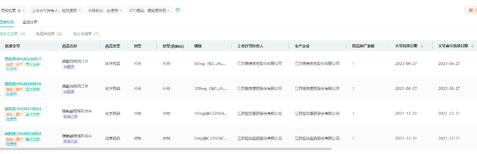 据药融云数据库,目前恒瑞医药共有在使用的糖尿病用药相关批文4条,涉及2个品种,其中磷酸瑞格列汀片、脯氨酸恒格列净片为独家新药品种。
