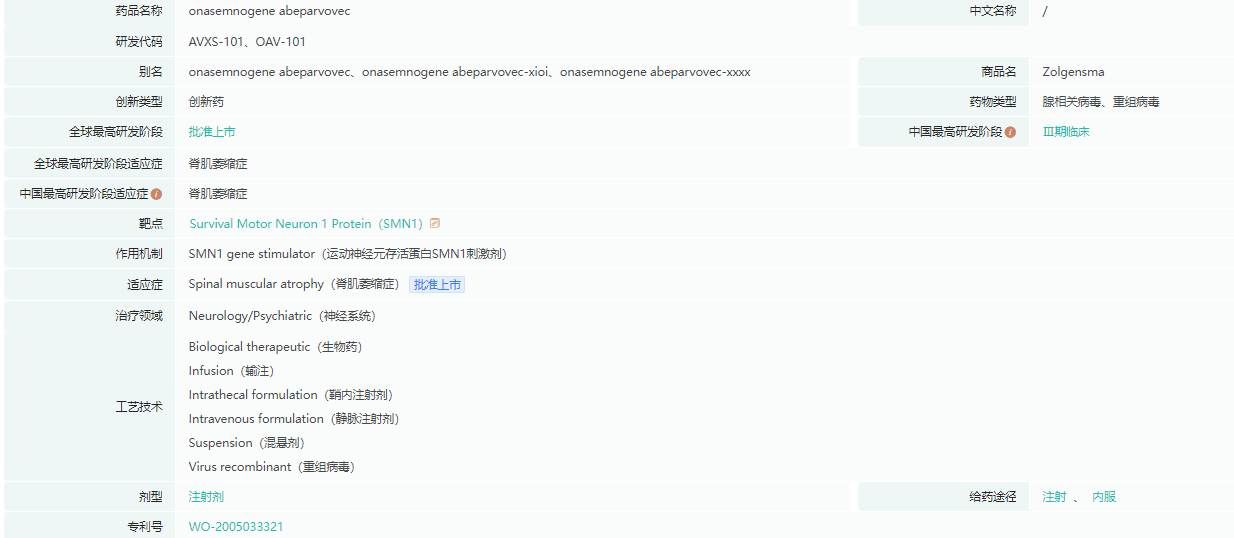Zolgensma是一种基于腺相关病毒9型载体的基因疗法,用于治疗2岁以下患有运动神经元存活基因1等位突变导致的脊髓性肌萎缩症的儿童患者。