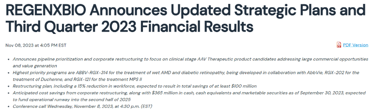 11月8日,REGENXBIO宣布了第三季度财务业绩以及最近的运营亮点,包括战略管线优先顺序和公司重组,旨在大幅减少运营开支,公司正在缩小基因治疗项目的范围,将重点放在三个基因治疗项目上,同时继续支持公司强大的AAV基因疗法管线产生有意义的价值。为此公司已经裁员15% ,主要是从事罕见的神经退行性疾病开发、早期研究以及其他一般和行政领域的员工。该公司拥有约400名员工,这意味着大约有60名员工被解雇。
