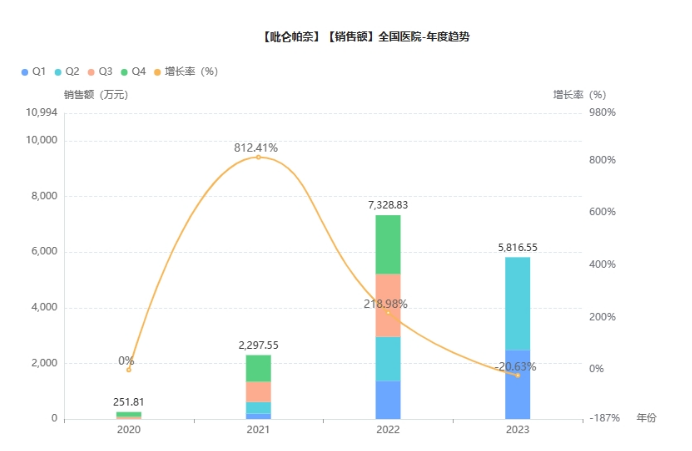 根据卫材财报,吡仑帕奈的2022年全球销售额约合18.6亿人民币(约3亿美元)。据药融云数据统计,2022年全国院内销售达7329万元,同比增长219%,一跃进入抗癫痫药全国医院销售TOP15内的产品,市场潜力可期。