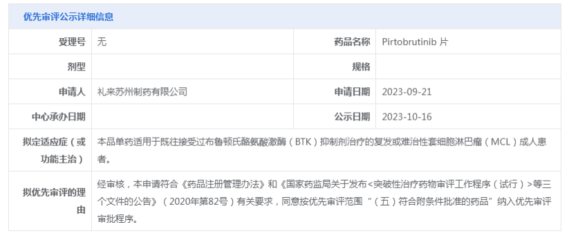 Pirtobrutinib片(吡托布鲁替尼)是礼来自主研发的 1 类创新药物、BTK抑制剂Pirtobrutinib片(吡托布鲁替尼)的上市申请拟纳入优先审评,用于既往接受过布鲁顿氏酪氨酸激酶(BTK)抑制剂治疗的复发或难治性套细胞淋巴瘤(MCL)成人患者。