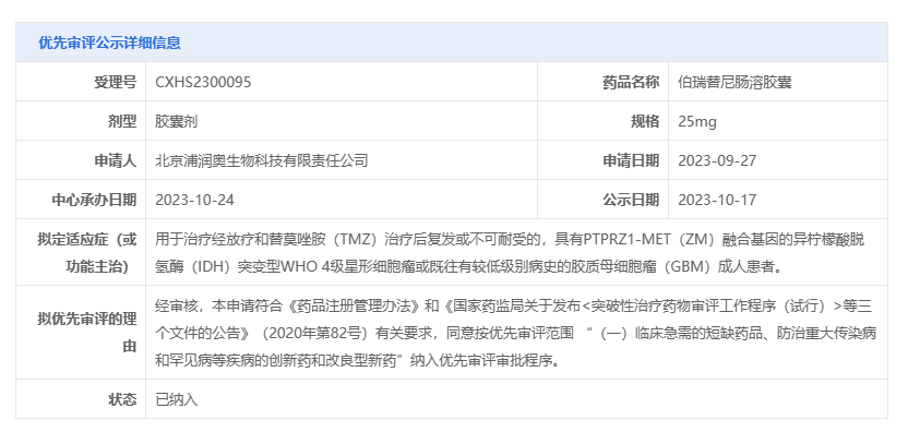 伯瑞替尼肠溶胶囊(25mg/100mg)是北京浦润奥生物科技有限责任公司研发,伯瑞替尼是一款小分子选择性MET抑制剂。根据今年7月鞍石生物发布的新闻稿,该公司已递交脑胶质瘤新适应症的pre-NDA申请,拟用于治疗经放疗和替莫唑胺治疗后复发或不可耐受的,具有PTPRZ1-MET融合基因的IDH突变型WHO 4级星形细胞瘤或既往有较低级别病史的胶质母细胞瘤(GBM)成人患者。