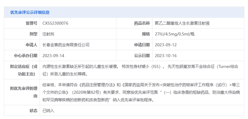 聚乙二醇重组人生长激素注射液(商品名:金赛增)是长春高新旗下的金赛药业研发,于2014年1月首次获批上市,是我国首个且目前唯一市场在售的长效人生长激素。据悉,该产品每周仅需注射一次,能有效避免漏针情况的同时,提高患儿的耐受度、依从性和治疗效果。