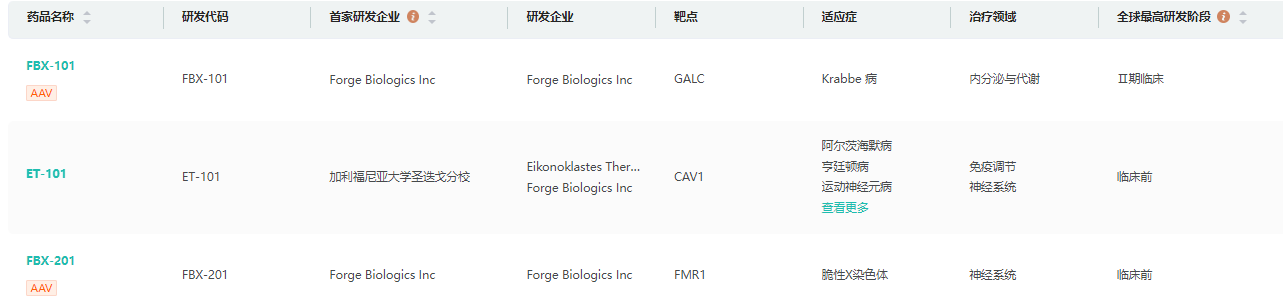 Forge Biologics (Forge)成立于2020年,总部位于美国俄亥俄州,是一家基因疗法的合同开发和制造组织(CDMO),主要进行基于腺相关病毒(AAV)和质粒基因治疗药物的研发。该公司已完成C轮融资,累计筹款金额达到 3.3 亿美元。Forge的主导项目FBX-101是一种新型的AAV和脐带移植相结合的方法,用于治疗婴儿 Krabbe 病(一种致命的神经退行性疾病)。