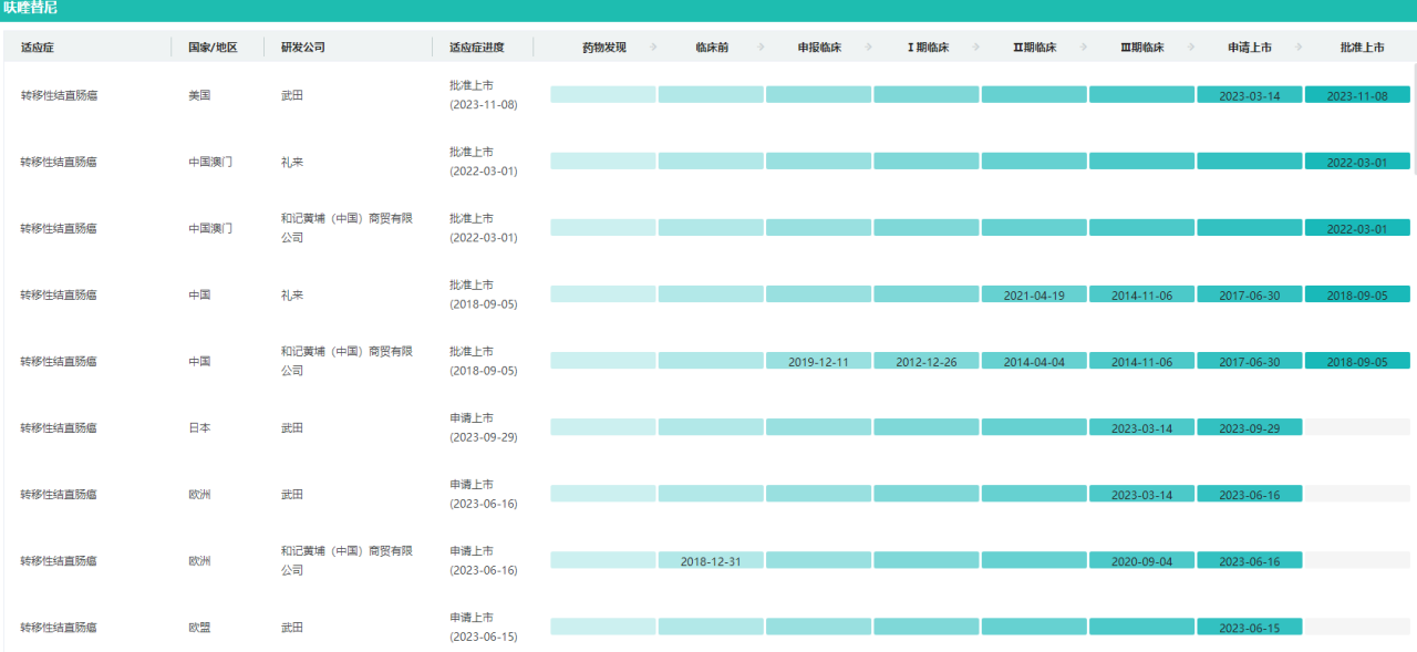 Fruzaqla是美国首个且唯一获批用于治疗经治转移性结直肠癌的针对全部三种VEGF受体的高选择性抑制剂。药融云数据库显示,2022年12月,和黄医药向FDA滚动提交呋喹替尼用于治疗难治性转移性结直肠癌的新药上市申请,2023年3月,和黄医药完成滚动提交上市申请。