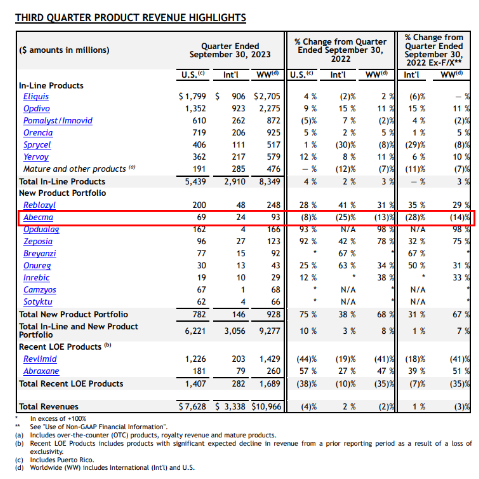 根据BMS的报告,第三季度Abecma在美国的收入为6900万美元,较第二季度的销售额下降了40%。2seventy公司将销售额下降归因于与传奇生物与强生制药的靶向BCMA的CAR-T疗法药物Carvykti的 "竞争加剧"以及6月份计划中的生产维护。