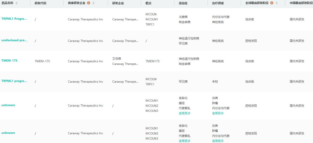 Caraway是一家临床前生物制药公司,致力于采用创新方法治疗遗传性神经退行性疾病和罕见疾病。药融云数据库显示,该公司已经建立了一系列新的小分子疗法,用于治疗遗传性神经退行性疾病和罕见疾病,包括阿尔茨海默病,帕金森病,肌萎缩侧索硬化(ALS)等。比如,其正在开发的靶向TRPML1的小分子调节剂,是用于治疗GBA相关帕金森病和其它神经退行性疾病。