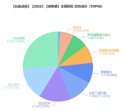 据药融云数据统计,在全国院内销售(化学和生物药)抗焦虑药市场格局主要由8种药物占据,包括坦度螺酮、奥沙西泮、丁螺环酮、劳拉西泮、阿普唑仑、地西泮、瑞马唑仑、复方地西泮。其中阿普唑仑在2022年全国院内销售超1亿元,同比增长达19.18%。