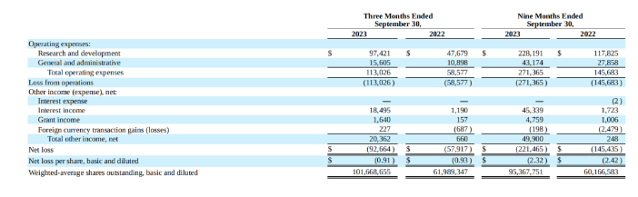 由于尚未有产品销售收入,Vaxcyte每年都在亏损,截至2023年9月30日,该公司累计赤字为7.436亿美元,但同时Vaxcyte拥有14.342亿美元的现金、现金等价物和投资资产,满足未来至少12个月的运营费用和资本支出要求。