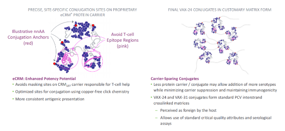 Vaxcyte利用无细胞蛋白质合成平台开发的24价肺炎球菌结合疫苗VAX-24,解决传统结合疫苗的缺陷,实现了位点特异性偶联,与传统随机偶联相比,精确偶联增强了标准蛋白载体的效力,采用“点击化学”偶联方法,减少对蛋白载体或靶抗原上的关键免疫原性表位的损害。