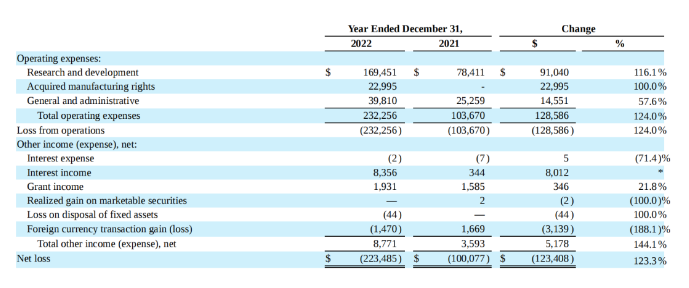 2022年,Vaxcyte全年R&D费用高达1.695亿美元,同比增加116.1%,主要是因为VAX-24和VAX-31项目临床开发费用增加;G&A费用为3981万美元,同比增加57.6%,主要是因为员工增加;2022全年净亏损为2.235亿美元,同比增加123.3%。