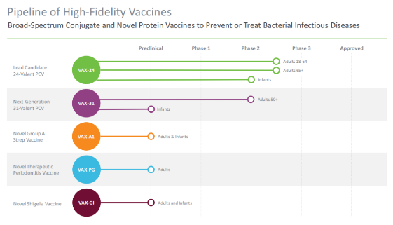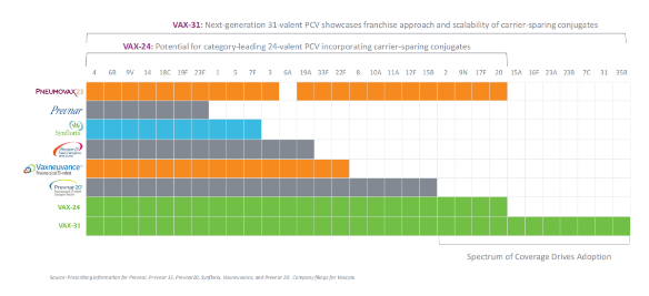 据该公司分析,与目前的标准方案相比,VAX-24有可能在美国成年人中增加14-26%的IPD覆盖率。而Vaxcyte另一款在研的31价肺炎球菌结合疫苗VAX-31在VAX-24的基础上将覆盖范围扩大到31种菌株,估计将覆盖目前美国人群中约95%的IPD流行菌株。