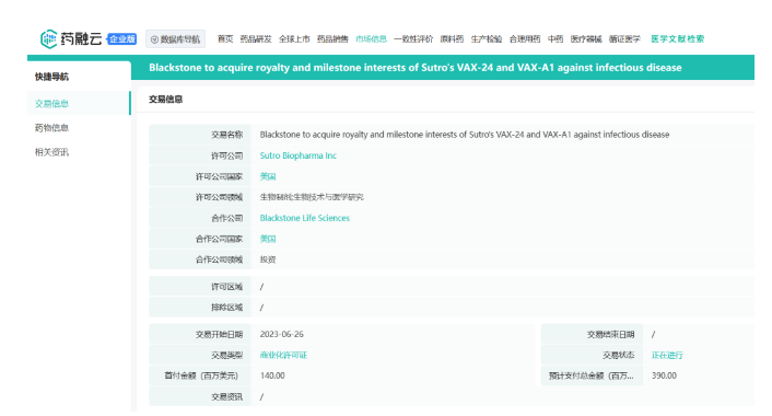 根据许可协议,Vaxcyte有权利用Sutro Biopharma的XpressCF和XpressCF+™平台开发预防或治疗传染病的疫苗产品,Sutro Biopharma则保留发现和开发非传染性疾病的疫苗的权利,例如癌症。Sutro还有资格获得未来Vaxcyte疫苗产品全球销售额4%的特许权使用费,不过这部分潜在的特许权使用费已在2023年8月转让给Blackstone Life Sciences,药融云数据库显示,Blackstone将向Sutro支付1.4亿美元的预付款以及未来高达2.5亿美元的潜在里程碑付款,交易总额为3.9亿美元。