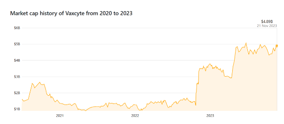 2020年5月,SutroVax宣布更名为Vaxcyte,从而更加准确地反映公司专注于疫苗开发的使命。次月,Vaxcyte登陆纳斯达克全球精选市场(NASDAQ:PCVX),IPO募得资金2.875亿美元,当时市值12.65亿美元,到2023年11月21日,该公司总市值已超过48亿美元,几乎是当时的四倍。