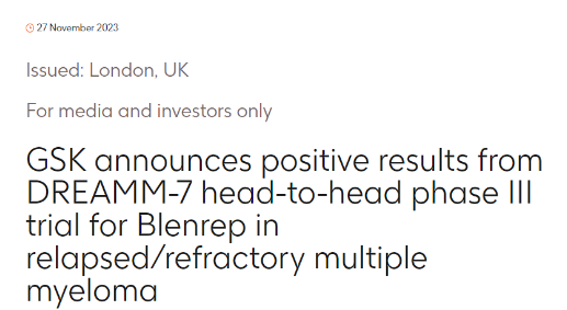 11月27日,GSK公布了DREAMM-7头对头Ⅲ期试验的中期疗效分析结果,该试验评估了belantamab mafodotin(Blenrep)作为复发或难治性多发性骨髓瘤的二线治疗疗效。