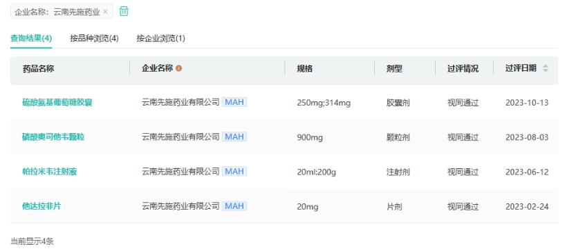 目前云南先施药业视同通过一致性评价的有硫酸氨基葡萄糖胶囊、磷酸奥司他韦颗粒、帕拉米韦注射液、他达拉非片4款品种。