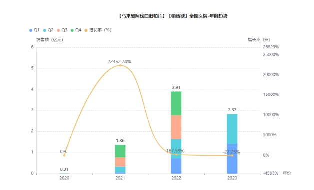 据药融云数据库统计,马来酸阿伐曲泊帕片自上市后便开始了高速放量,上市次年院内销售额便突破1亿元,2022年达3.9亿元,同比增长188%。目前,阿伐曲泊帕仅原研一家拥有批文。