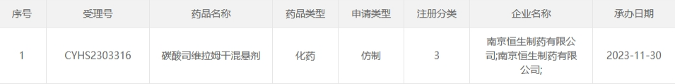 日前,南京恒生制药的3类仿制化药碳酸司维拉姆干混悬剂上市申请获CDE受理。目前该品种暂未在国内上市,这是第2家申报该品种上市的国产药企。此外,碳酸司维拉姆片的国内首仿也由南京恒生制药拿下。