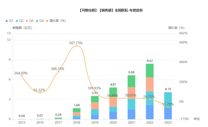 司维拉姆原研来自赛诺菲Genzyme,主要用于控制正在接受透析治疗的慢性肾脏病(CKD)成人患者的高磷血症,为国家医保品种(乙类)。适应症虽然狭窄,但由于中国成人慢性肾病的高发病率(约10.8%),该品种在国内的市场依然稳步增长。据药融云统计,2022年院内销售额超8亿元,同比增长达26.3% 。