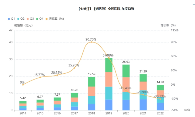 近年来,受专利到期、仿制药竞品等因素影响,众多企业的生物类似药入场围猎,罗氏的市场份额被逐渐瓜分蚕食,老"三驾马车"的营收一直在走下坡路。根据药融云数据统计,2021年美罗华在全国院内的销售额高达19亿元,然而在2022年却下滑至13亿元。与此同时,赫赛汀和安维汀的销售额也经历了类似的下滑。2021年,赫赛汀在全国院内销售额达到46亿元,而2022年,销售额下滑至41亿元。安维汀的销售额在2021年全国院内销售达到21亿元,然而到2022年却急剧下滑至14亿元,形势不容乐观。