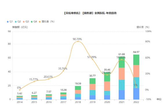 贝伐珠单抗在2022年全国院内销售TOP10企业榜单中,齐鲁制药以54%的市场份额超越了原研罗氏,宣告原研市场的“独享期”正式结束。同时,信达生物、苏州盛迪亚生物医药以及山东博安生物等国内药企也成功跻身市场入围名单。如今,贝伐珠单抗市场的竞争愈演愈烈,既有昔日霸主逐渐陨落,也有新兴强者崭露头角,为市场格局注入了全新的活力。这场大戏般的竞争,无疑将为医药行业带来更多的精彩与变数。
