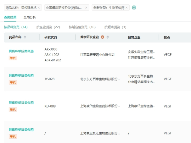 根据药融云数据统计,目前国内有北京东方百泰生物、江苏奥赛康药业、上海康岱生物医药等超20家企业的贝伐珠单抗药物正处于临床试验阶段,使得该领域进入了疯狂的“内卷”阶段。