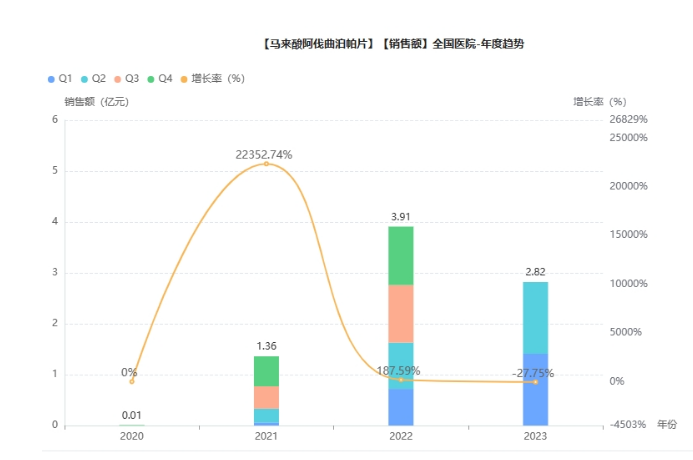 据药融云数据库统计,马来酸阿伐曲泊帕片自上市后便开始了高速放量,上市次年院内销售额便突破1亿元,2022年达3.9亿元,同比增长超187% ,2023年H1全国院内销售达2.8亿元,已接近2022全年销售额,这一数据充分显示了该品种具有很大的市场潜力。