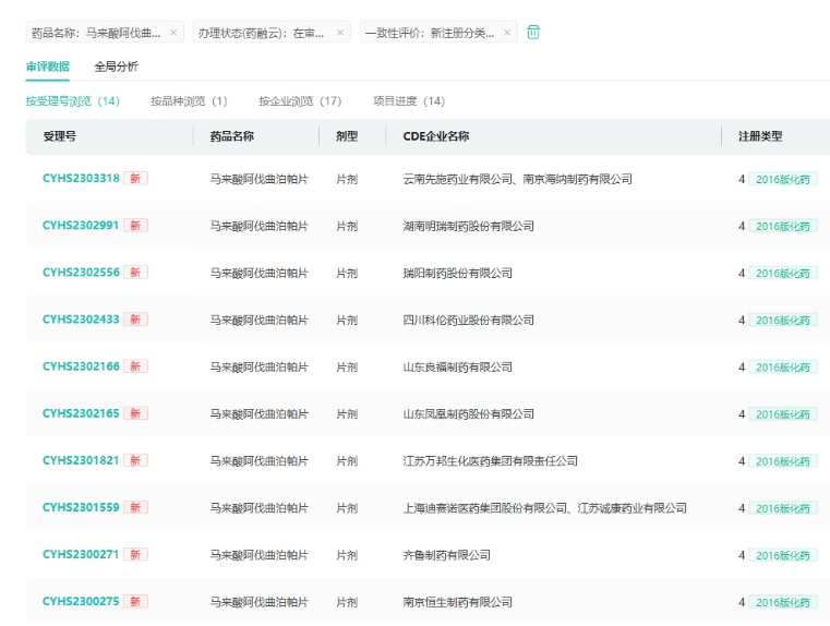 据药融云数据统计,目前马来酸阿伐曲泊帕片还有齐鲁制药、江苏万邦生化医药、成都倍特药业、四川科伦药业等17家企业提交了仿制申请,均在审评审批中。南京正大天晴制药是最早提交马来酸阿伐曲泊帕片上市申请的企业,此次成功获批并顺利拿下该品种的首仿,市场占据先发优势。