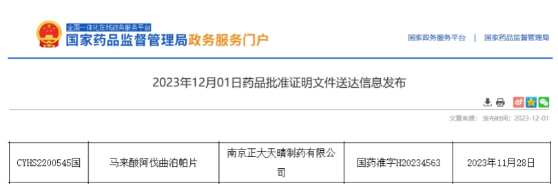 近日,据NMPA官网公示,南京正大天晴制药的4类仿制化药马来酸阿伐曲泊帕片获批上市视同通过一致性评价,并斩获该品种首仿。据药融云数据统计,南京正大天晴已斩获8个首仿,此次马来酸阿伐曲泊帕片是今年最新斩获的第6个首仿。