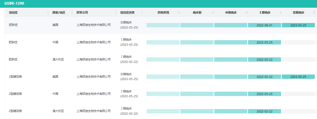 药融云数据库监测显示:硕迪生物管线中有两款GLP-1相关产品在研,一款是靶向GLP-1R的GSbR-1290,目前正处于Ⅰ期临床试验中;另一款是GLP1R/GIPR双靶点口服药物GSbR-1290,这两款药物均瞄准了2型糖尿病和肥胖适应症。
