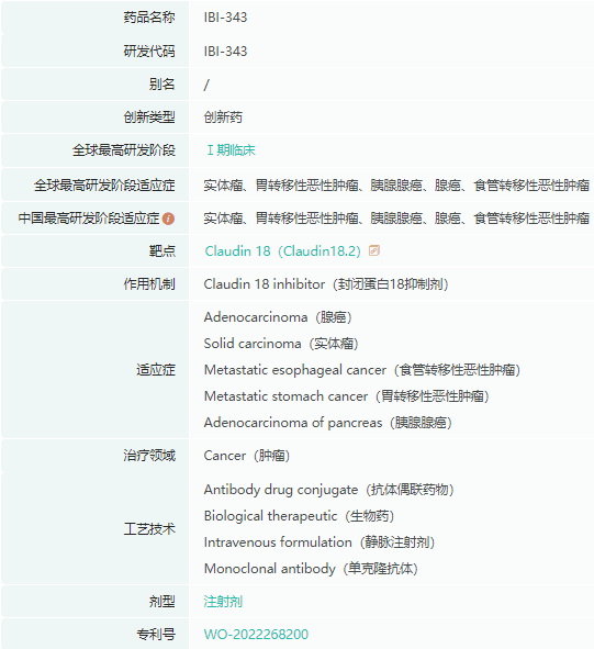 IBI343是重组人源抗CLDN18.2 ADC,与表达CLDN18.2的肿瘤细胞结合后,可发生CLDN18.2依赖性ADC内化,并释放毒素药物引起DNA损伤,导致肿瘤细胞凋亡。游离的毒素药物也可以通过质膜扩散到达并杀死相邻的肿瘤细胞,因此IBI343也具有旁观者效应(bystander effect)。目前IBI343在澳大利亚和中国进行临床Ⅰ期研究(NCT05458219),以评估IBI343在晚期实体瘤受试者中安全性、耐受性和初步有效性。