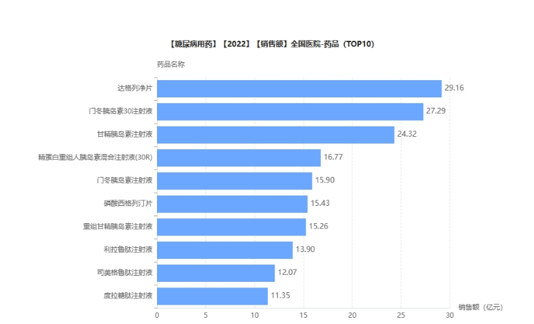 2022年糖尿病用药(化学或生物药)在全国院内销售市场,产品TOP10销售额均超过10亿元,其中达格净列片、门冬胰岛素30注射液和甘精胰岛素注射液是超24亿级大品种。其中司美格鲁肽注射液飞速逆袭,首次跃升进入前十名单,目前该品种仅有诺和诺德1家拥有生产批文。