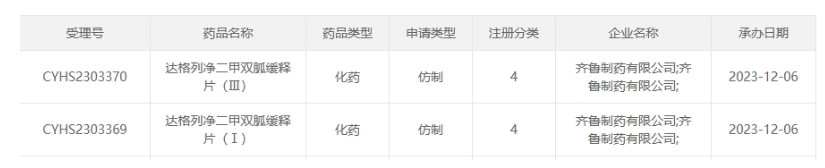 近日,据CDE官网显示,齐鲁制药提交的4类仿制化药达格列净二甲双胍缓释片(Ⅰ) / (Ⅲ)上市申请获CDE受理。据药融云数据统计,糖尿病用药在全国院内销售市场峰值超300亿元,目前国内尚未有达格列净二甲双胍缓释片仿制药获批。今年11月10日齐鲁制药申报的首个口服降糖1类新药QLR12018片获得临床试验默示许可,此次齐鲁制药又布局一款重磅复方降糖药,与正大天晴、北京福元医药、江苏宣泰药业等5家企业激战,猛攻首仿。