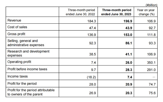 2023年第一季度收入1969亿日元(13.34亿美元),与上一年同期相比增加6.9%;营业利润260亿日元(1.76亿美元),与上一年同期相比大幅增加。收入增加主要是由于收到选择性雌激素受体降解剂elacestrant未来经济权利转让的预付款,以及抗癌剂Lenvima和失眠治疗药物Dayvigo的持续增长。