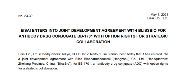 2023年5月,卫材宣布已与百力司康生物医药(杭州)有限公司(百力司康)就具有战略合作选择权的抗体偶联药物(ADC)BB-1701达成联合开发协议。根据合作协议,百力司康将获得首付款和里程碑付款,如卫材行使战略合作的选择权,百力司康将获得响应的行权付款,同时将获得总计可能高达20亿美元的开发与里程碑付款,以及销售分成,卫材会获得BB-1701的大中华区外全球权益。