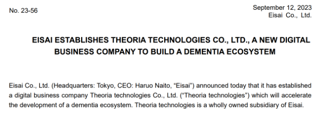近日,日本卫材宣布成立数字业务公司Theoria Technologies,以构建痴呆症生态系统,同时,Theoria Technologies将与卫材一起开发和提供Sasaeru,该应用程序通过记录痴呆患者的日常生活活动(ADL),帮助促进痴呆,医生和护理人员之间的交流。此外,Theoria技术将通过加强与其他公司的合作来促进数字服务的发展。