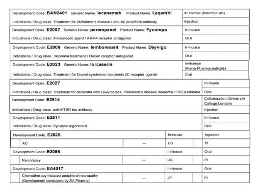 研发代码为E2511的研究药物有望促进受损胆碱能神经元的恢复和突触重塑,并抑制由神经变性引起的脑萎缩,该研究目前在美国地区进行到临床试验一期;代码为E2025的研究主要针对AD,在美国地区进行到临床试验一期;代码为E2086的研究在美国地区进行到临床试验一期,适应症为发作性睡病;研发代码为EA4017的研究在日本进行到临床试验一期,适应症为化疗诱导的周围神经病变(由EAPharma公司开发)。