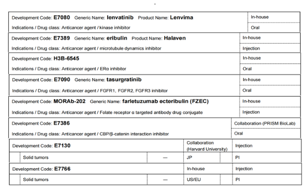 Lenvima(lenvatinib)是一种可口服的多激酶抑制剂,其选择性地抑制血管内皮生长因子受体(VEGFR1、VEGFR2和VEGFR3),以及成纤维细胞生长因子受体(FGFR1、FGFR2、FGFR3和FGFR4)的激酶活性,此外还抑制病原性血管生成、肿瘤生长和癌症进展相关的受体酪氨酸激酶。通过附属公司与默克公司联合开发:①与抗PD-1治疗帕博利珠单抗联合使用的研究,在日本、美国、欧盟和中国针对子宫内膜癌、非小细胞肺癌(非鳞状肺癌)、头颈部癌症、肝细胞癌(联合经导管动脉化疗栓塞)、食管癌(联合化疗)和胃癌(联合化疗)的研究进行到临床试验三期;在日本、美国和欧盟针对非小细胞肺癌(二线治疗方法)的研究进行到临床试验三期;在美国和欧盟针对结直肠癌(三线治疗)进行到临床试验三期,针对黑色素瘤(二线治疗)、选定的实体肿瘤(胃癌、结肠直肠癌、胶质母细胞瘤、胆道癌和胰腺癌)和头颈部癌症(二线治疗方案)进行到临床试验二期。②与抗癌药物依维莫司联合使用,在日本、美国和欧盟针对肾细胞癌(一线研究)的研究进行到临床试验三期。与小野制药联合开发,与抗PD-1抗体纳武利尤单抗联合开发,在日本针对肝细胞癌的研究进行到临床试验一期。
